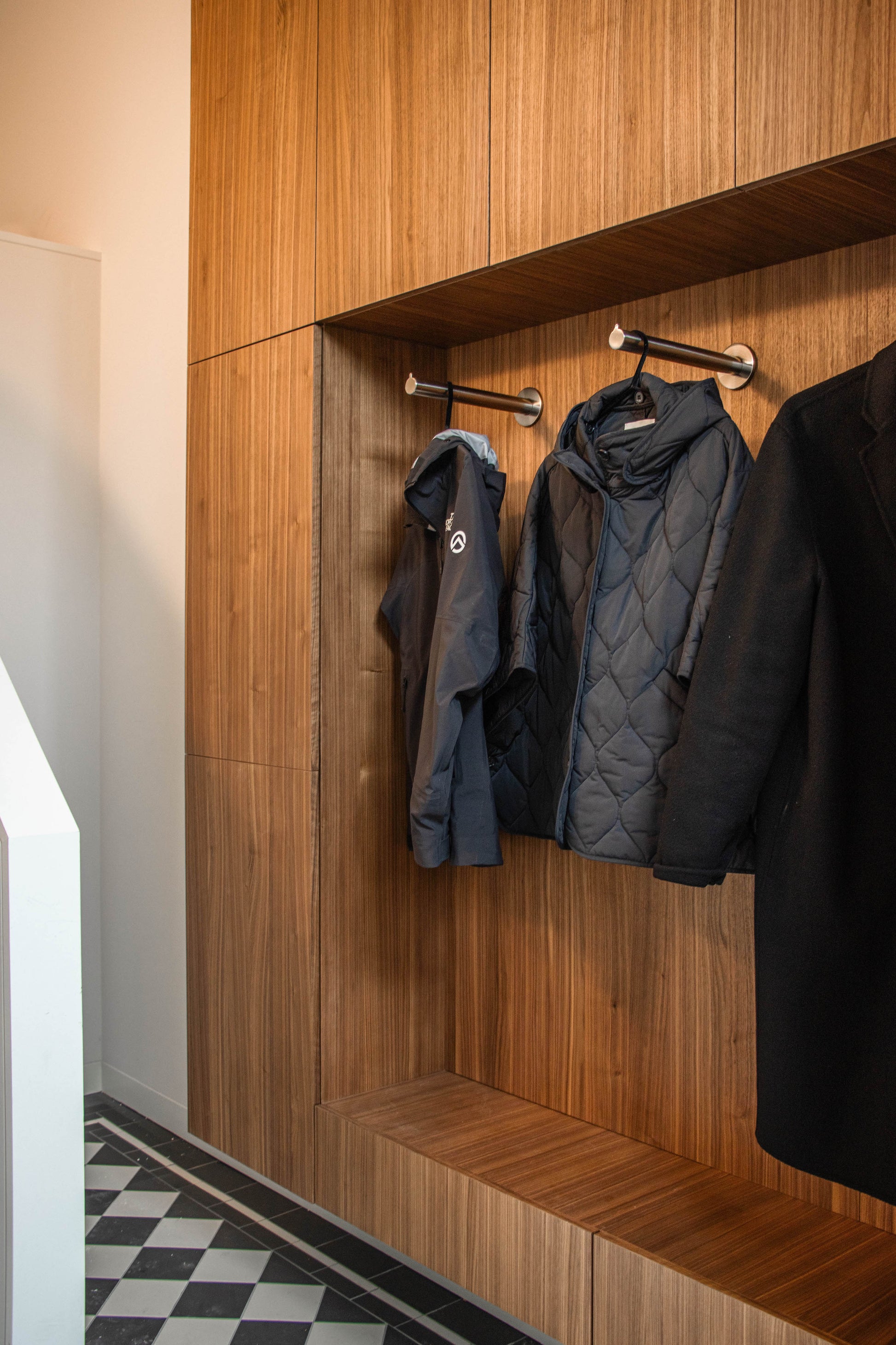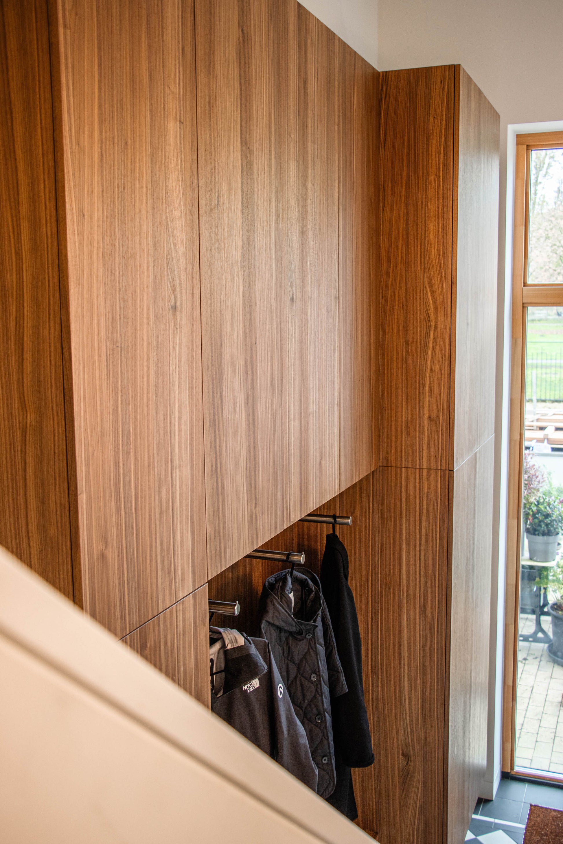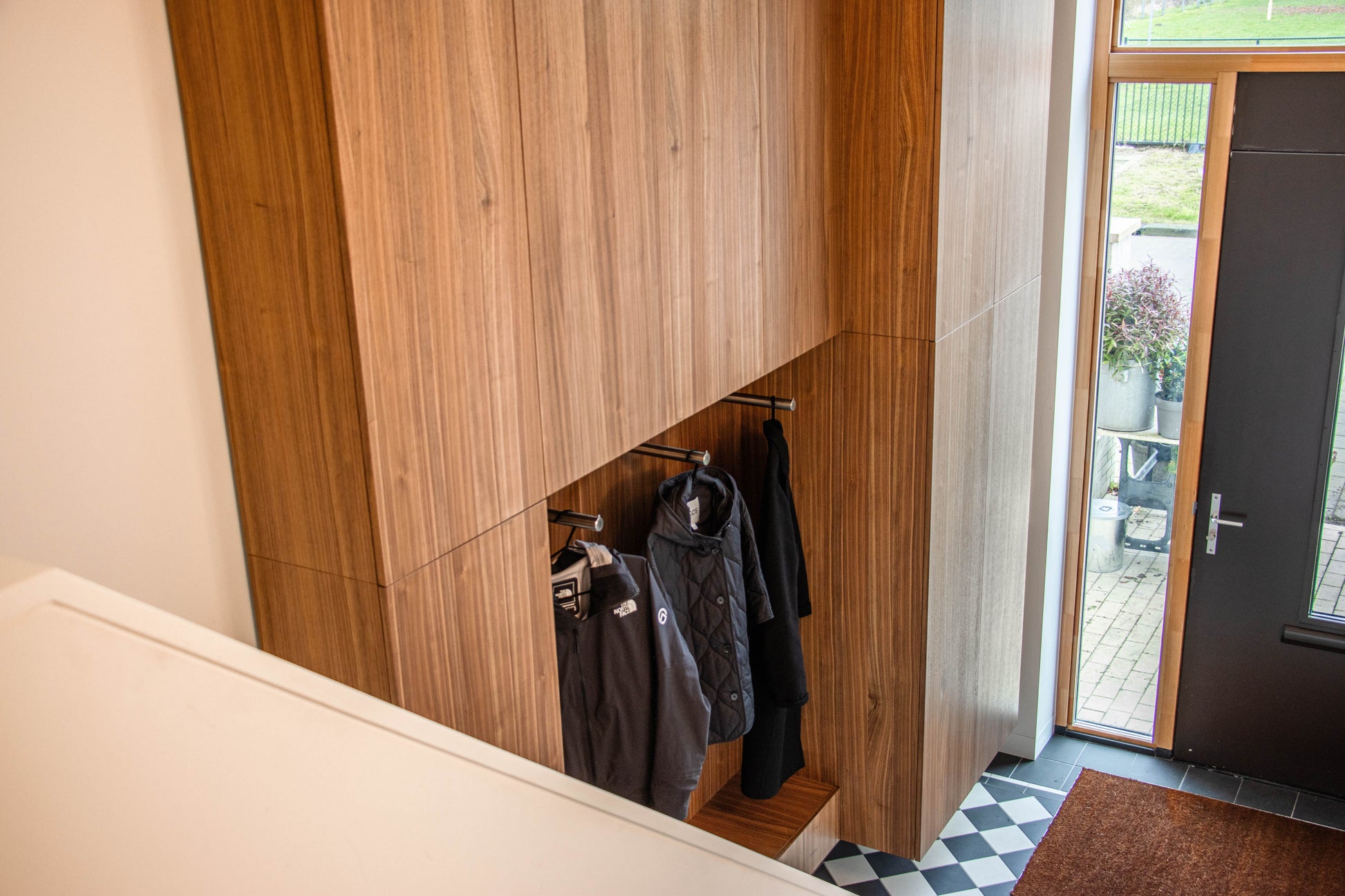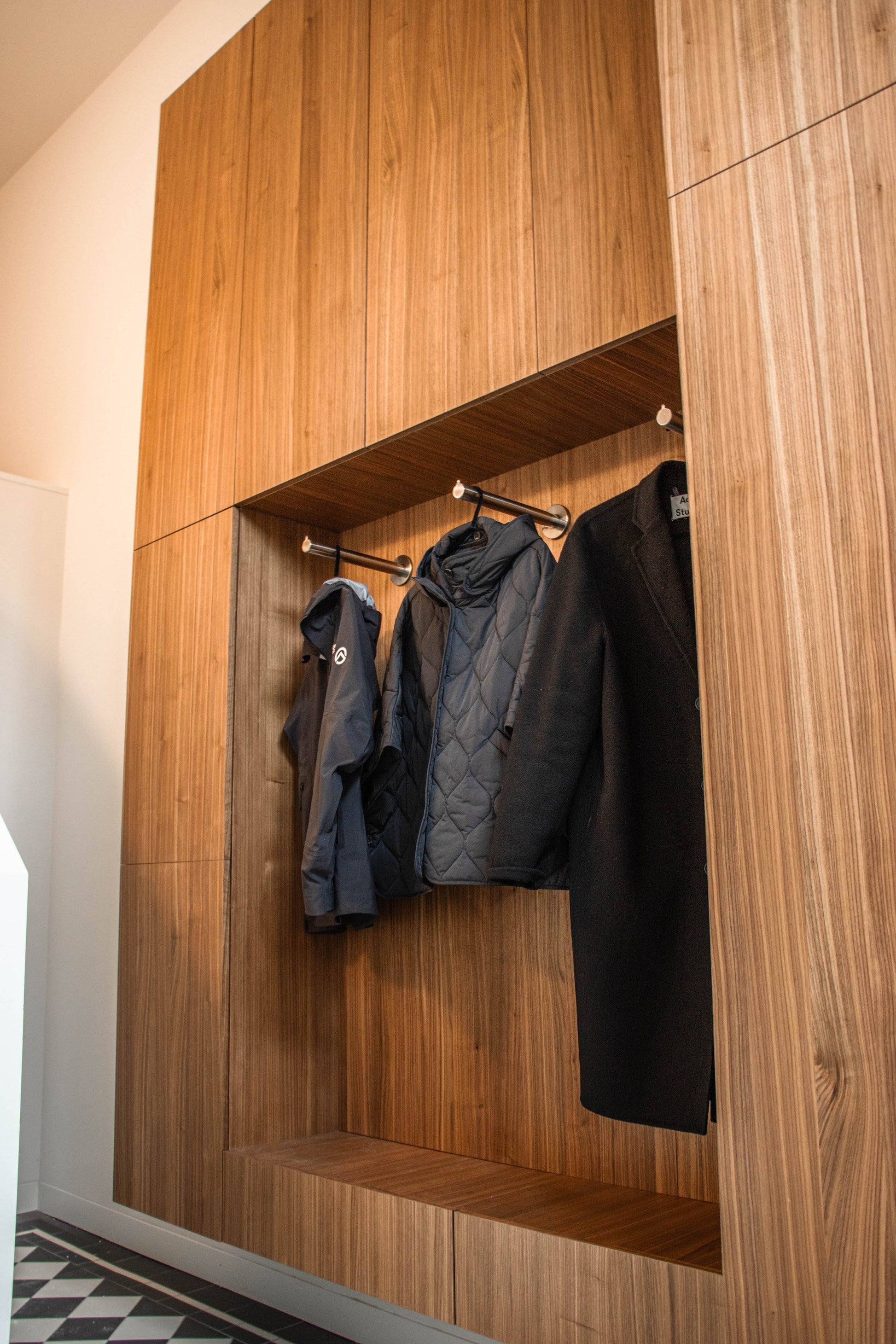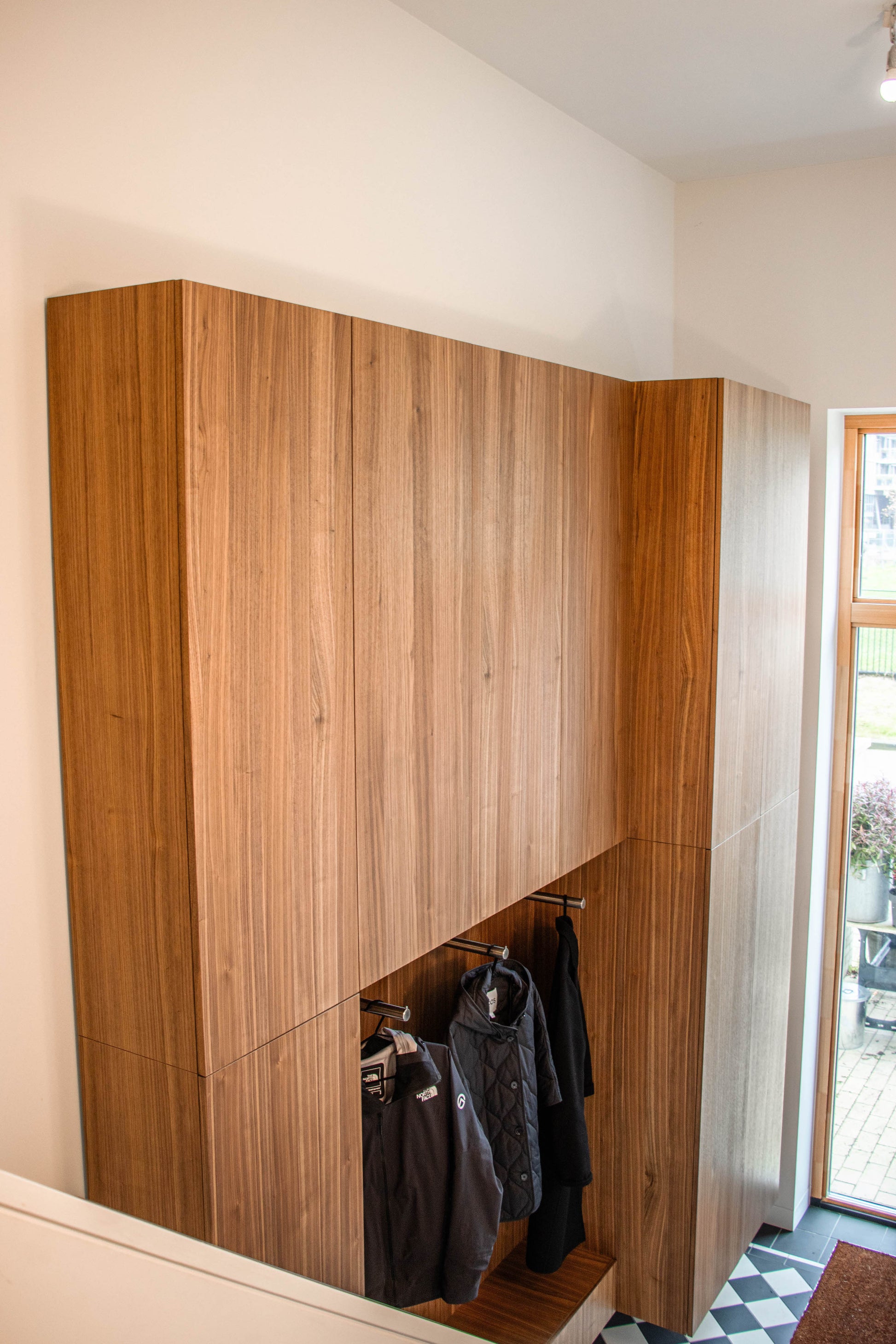 De kast biedt niet alleen praktische opbergruimte, maar integreert ook een handige nis met roede voor jassen en een zitbankje om schoenen aan of uit te trekken. Alles is met oog voor detail ontworpen, van de strakke lijnen tot de onzichtbare grepen en het doorlopende houtpatroon over de kastdeuren.