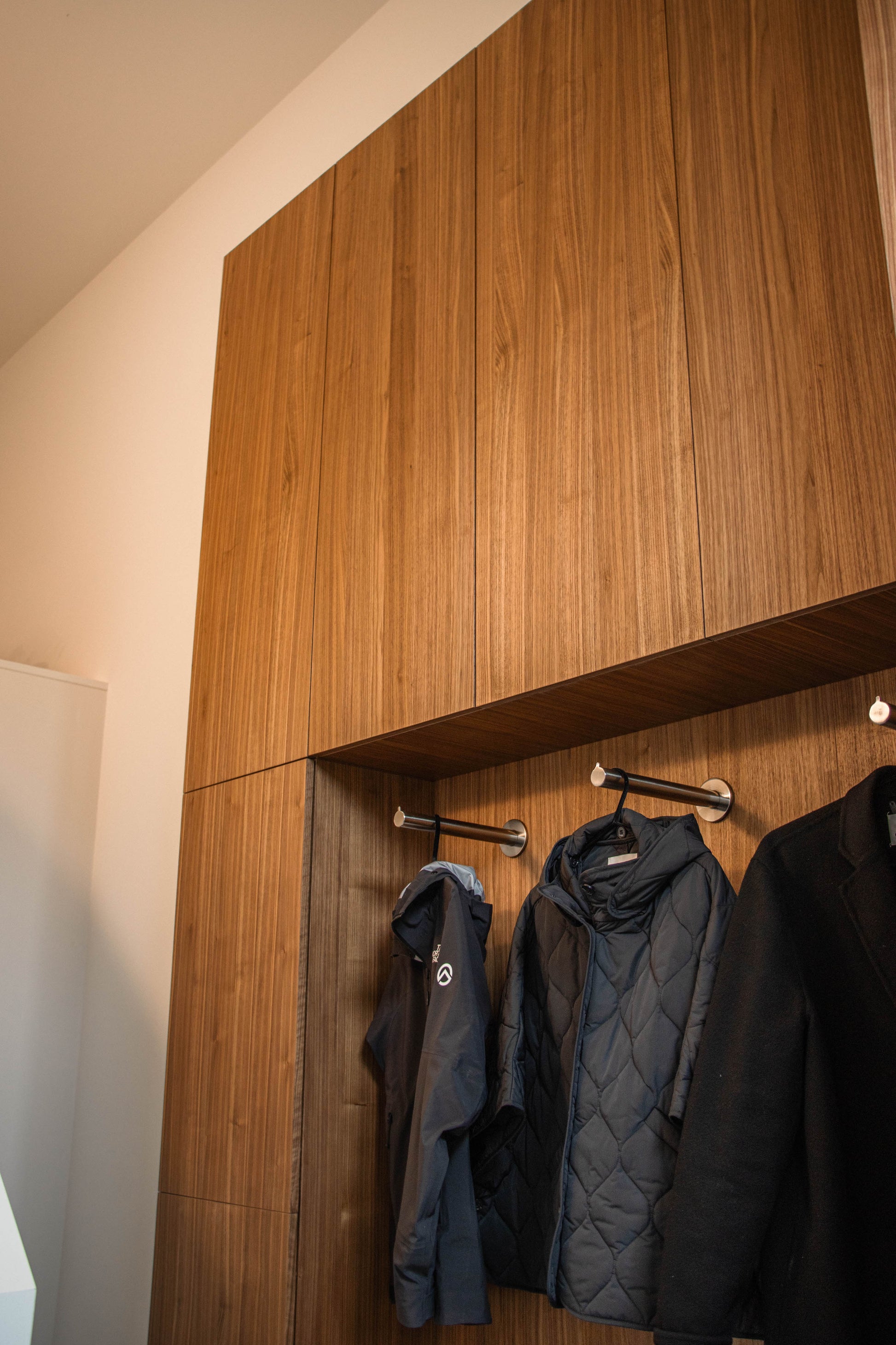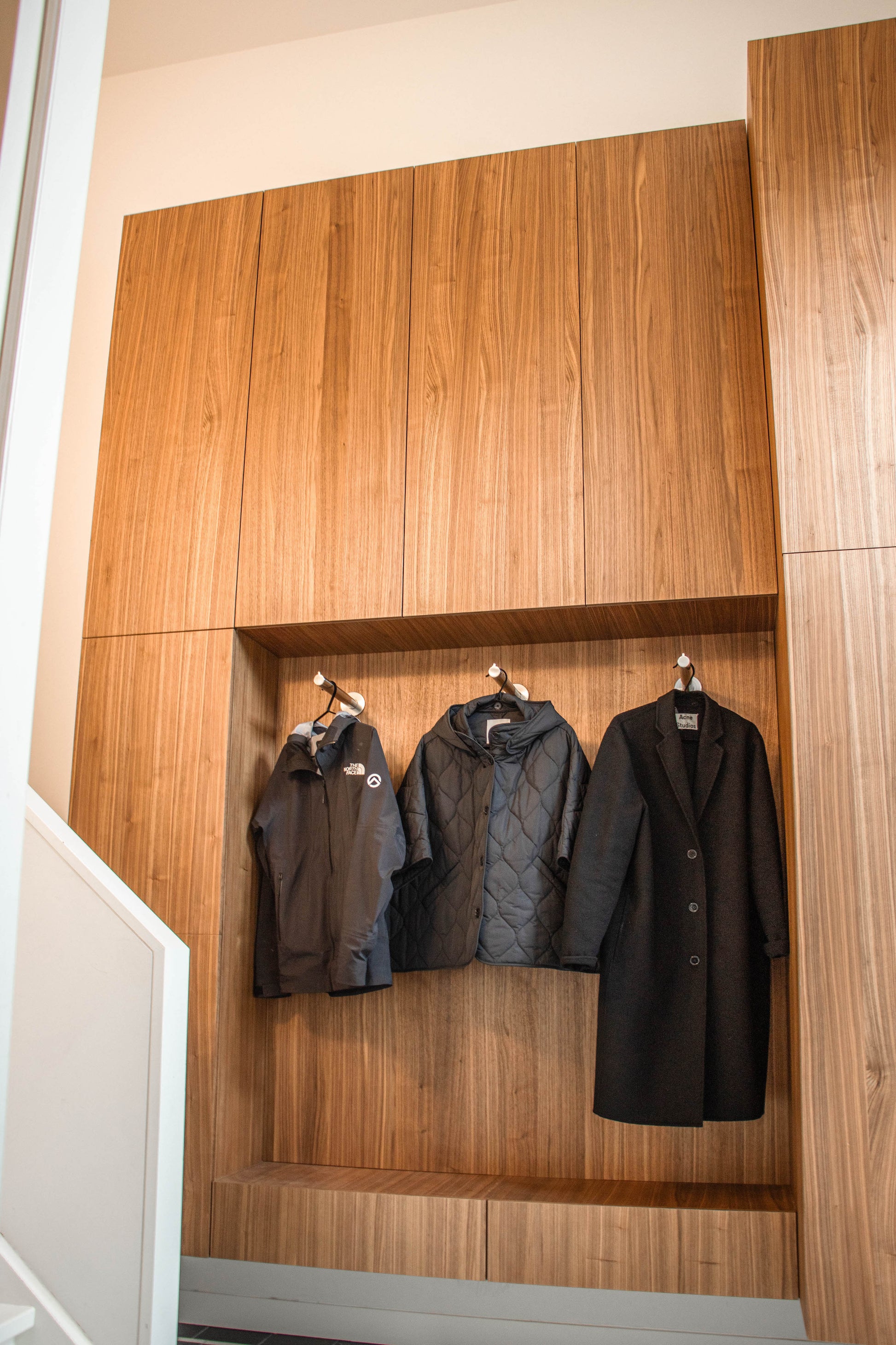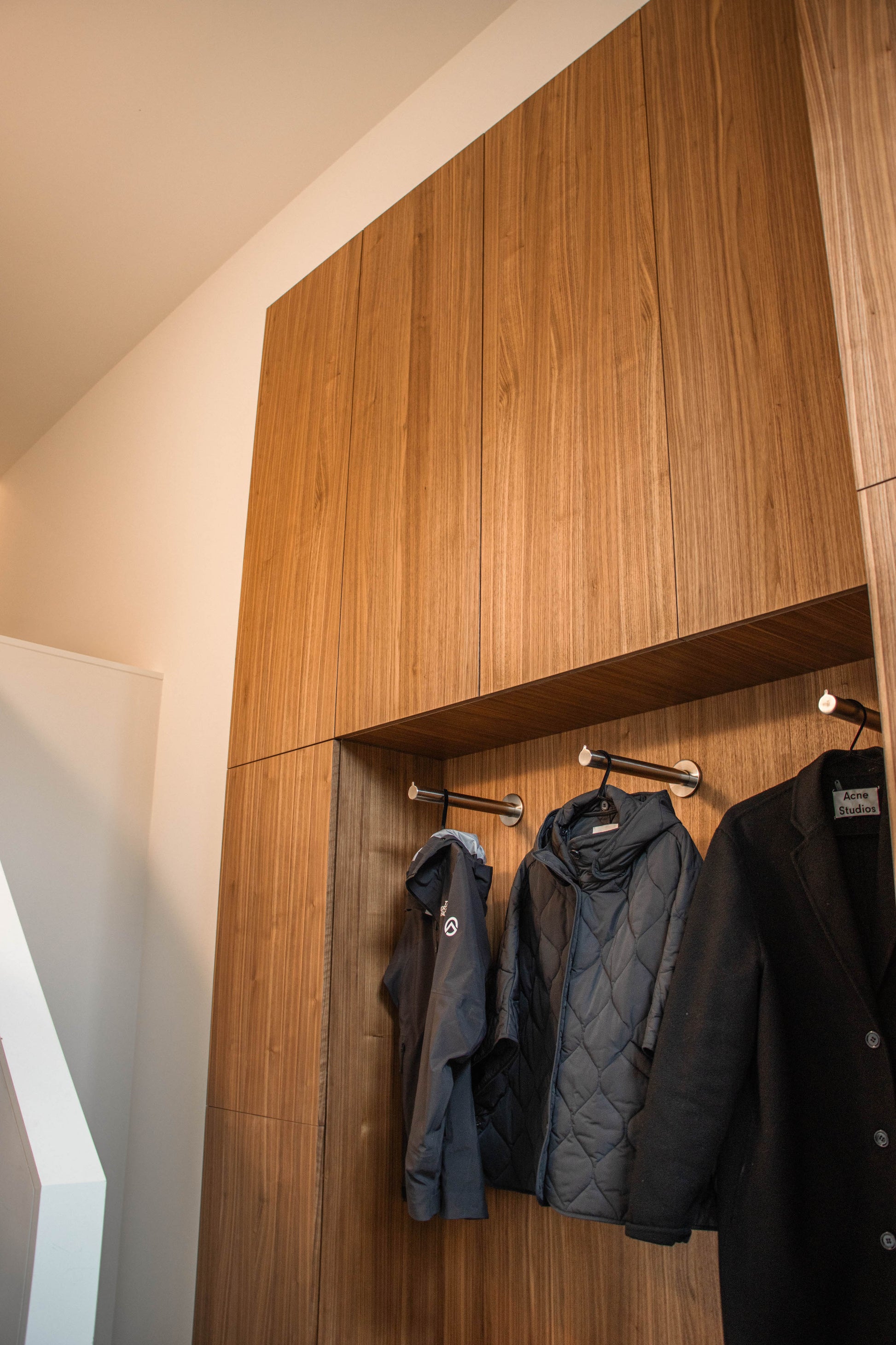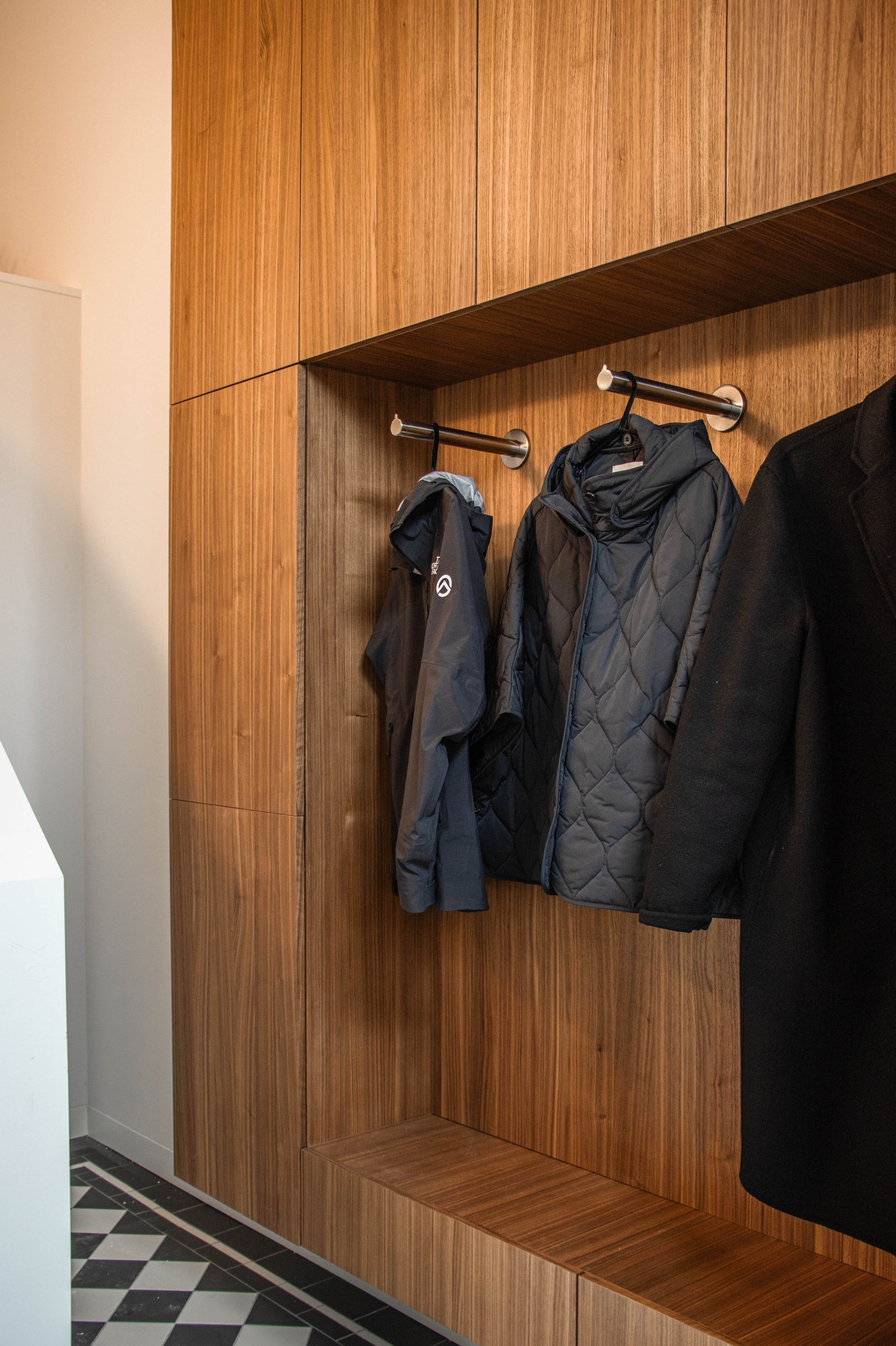 De kast biedt niet alleen praktische opbergruimte, maar integreert ook een handige nis met roede voor jassen en een zitbankje om schoenen aan of uit te trekken. Alles is met oog voor detail ontworpen, van de strakke lijnen tot de onzichtbare grepen en het doorlopende houtpatroon over de kastdeuren.