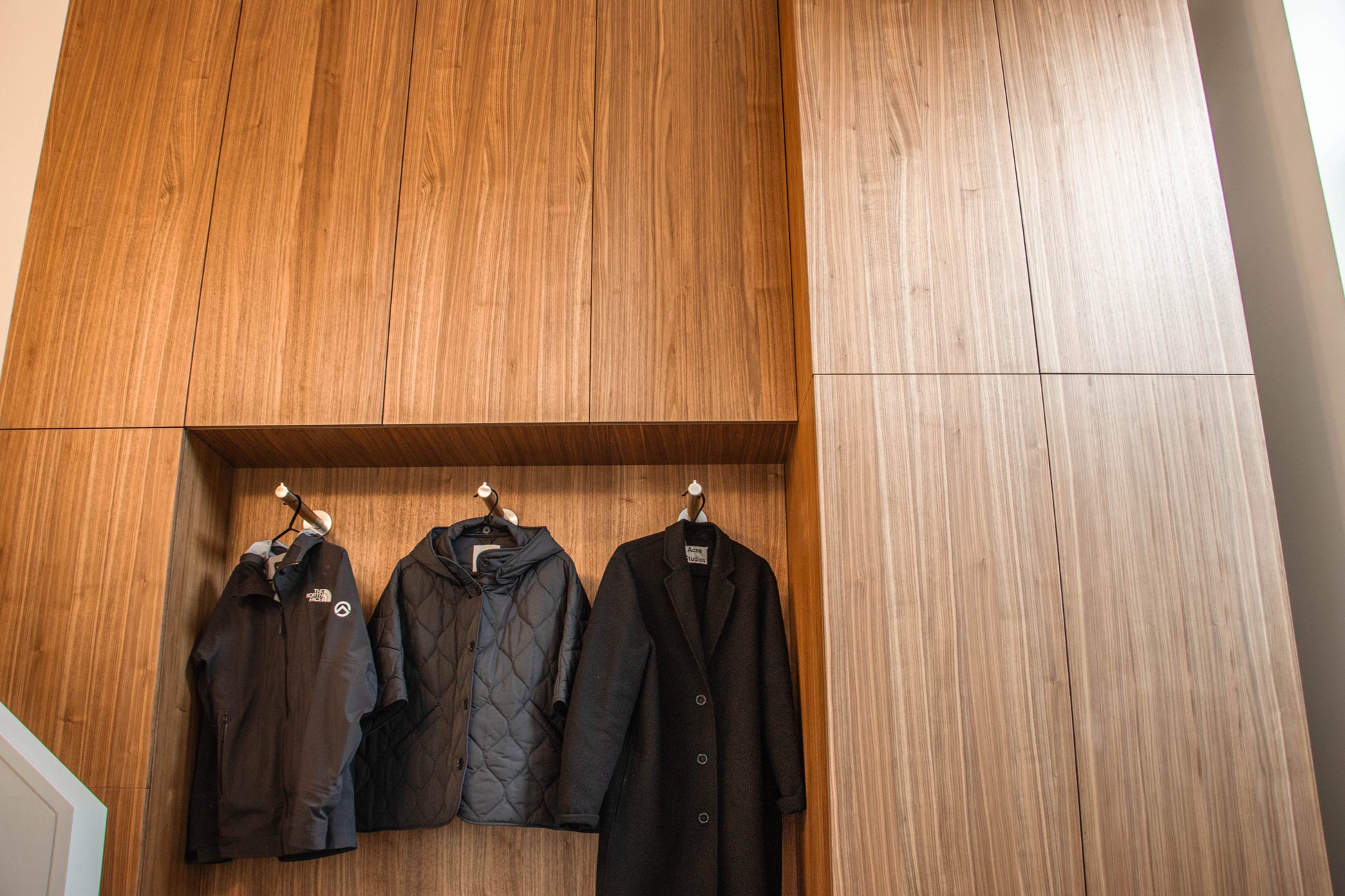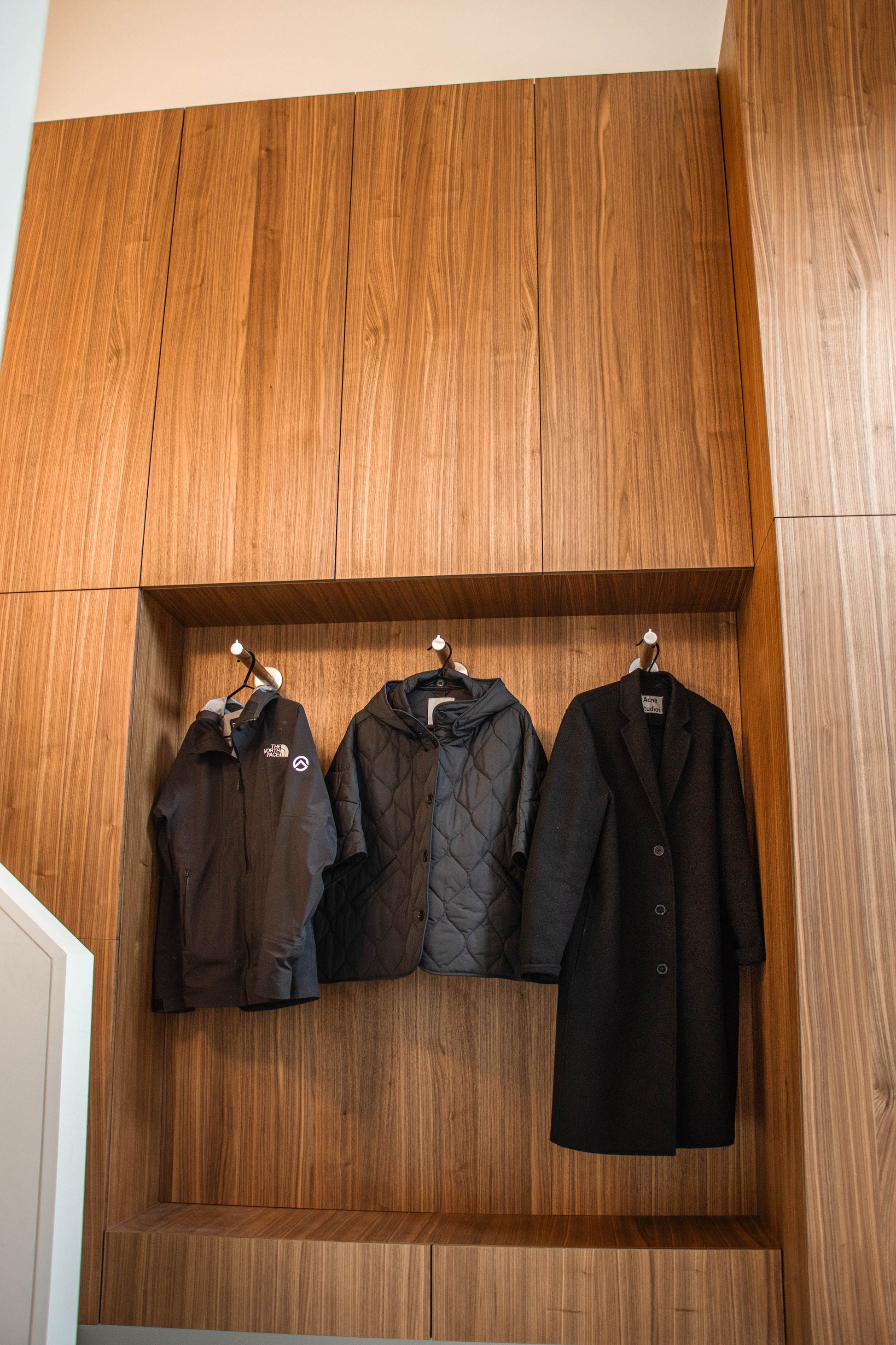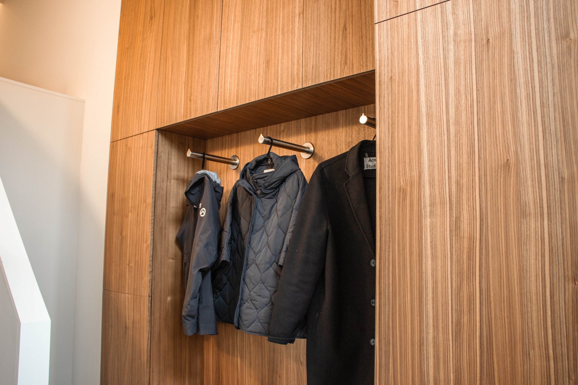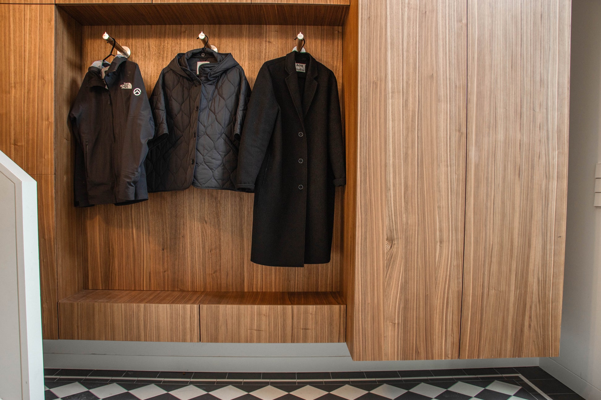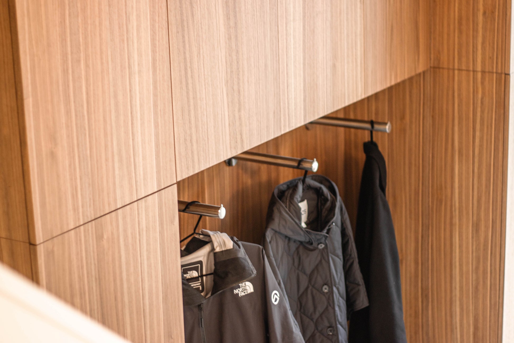 De kast biedt niet alleen praktische opbergruimte, maar integreert ook een handige nis met roede voor jassen en een zitbankje om schoenen aan of uit te trekken. Alles is met oog voor detail ontworpen, van de strakke lijnen tot de onzichtbare grepen en het doorlopende houtpatroon over de kastdeuren.