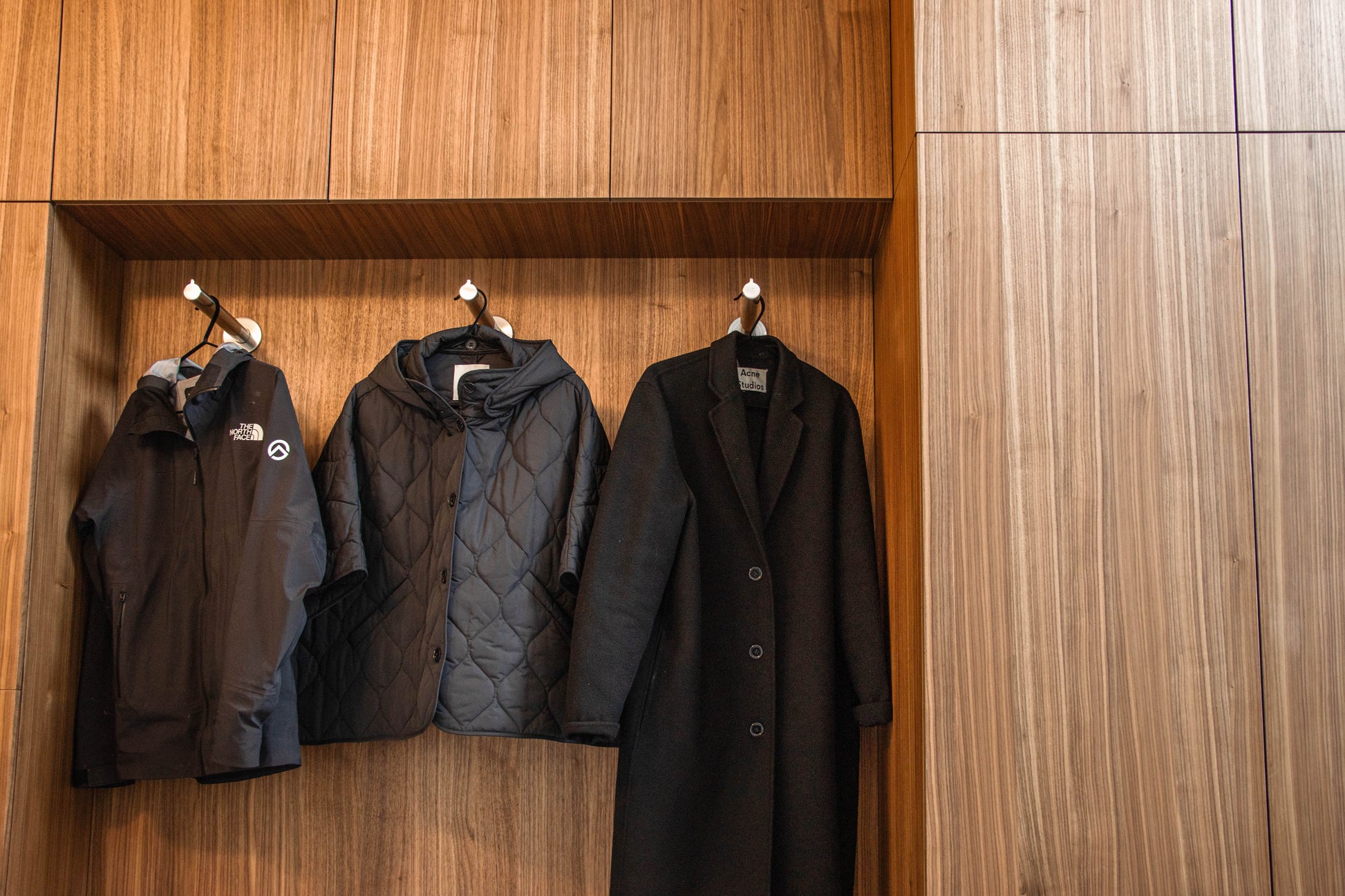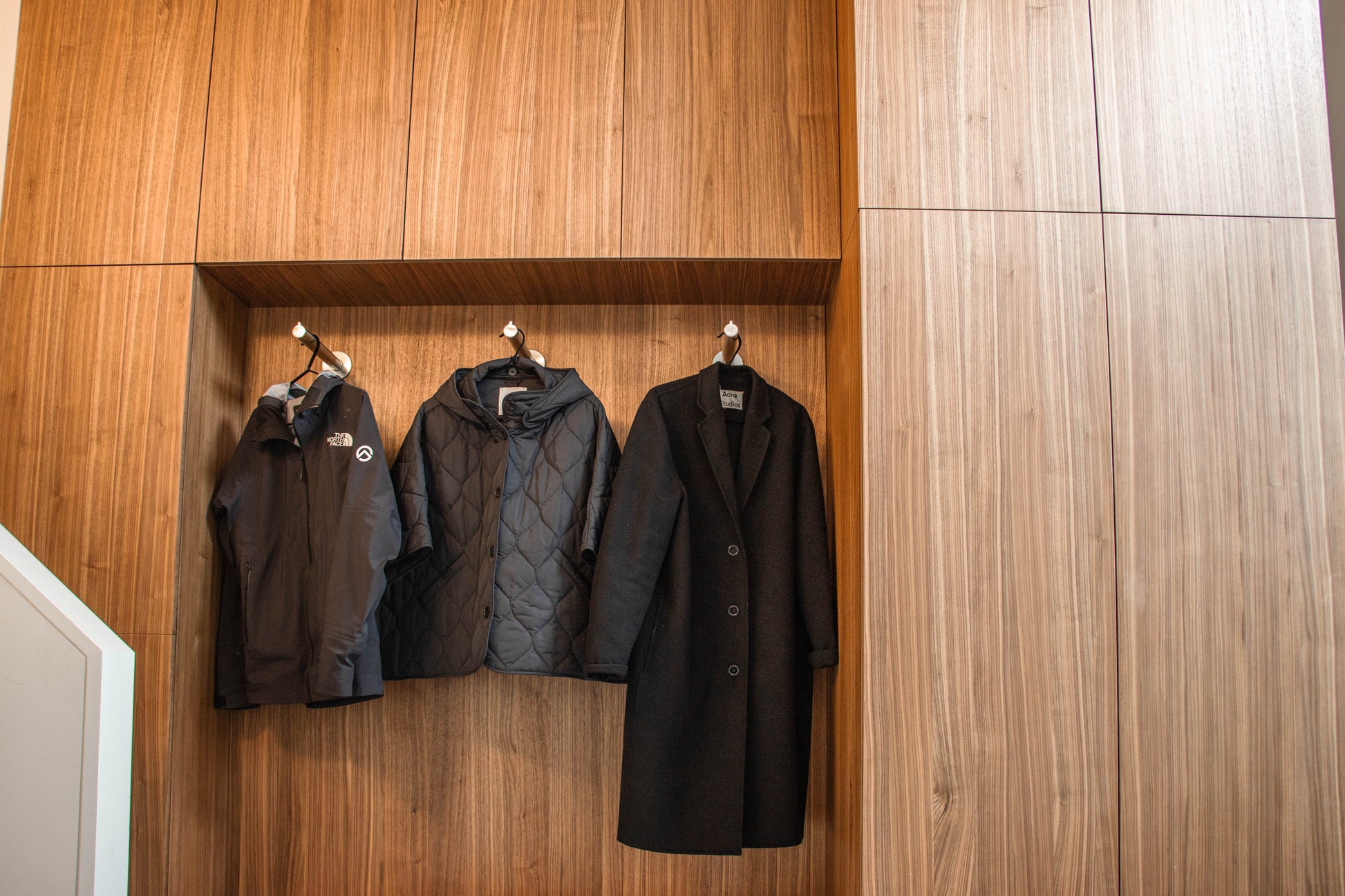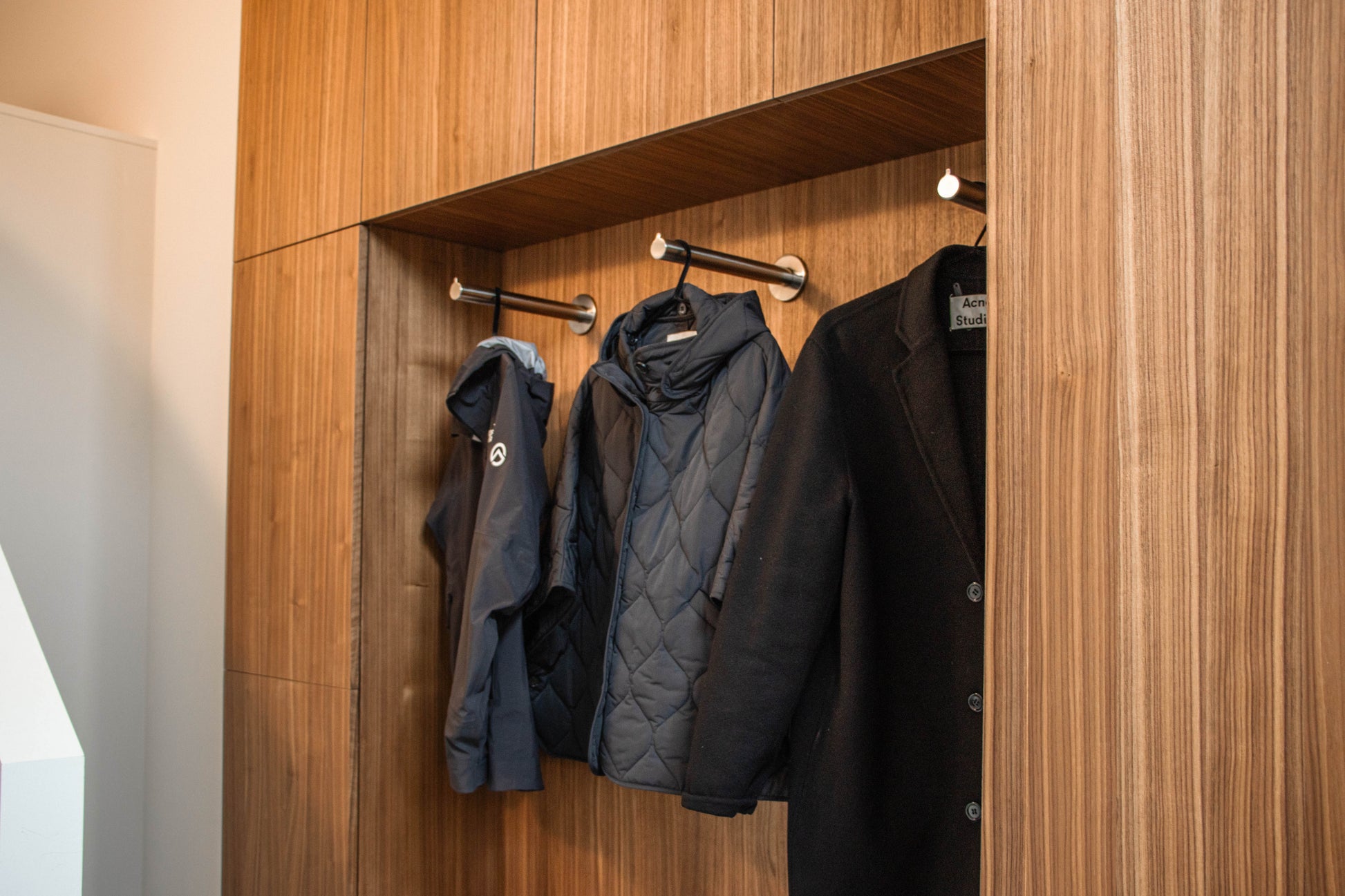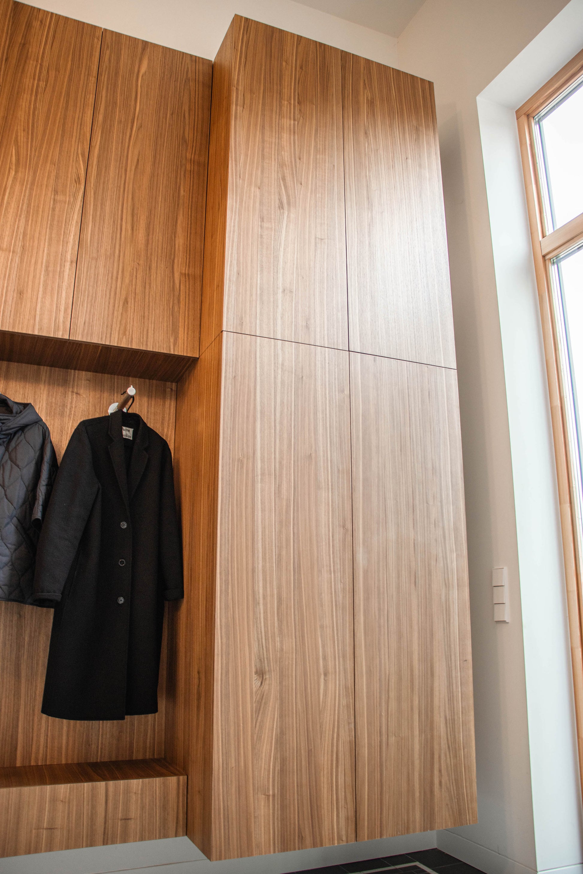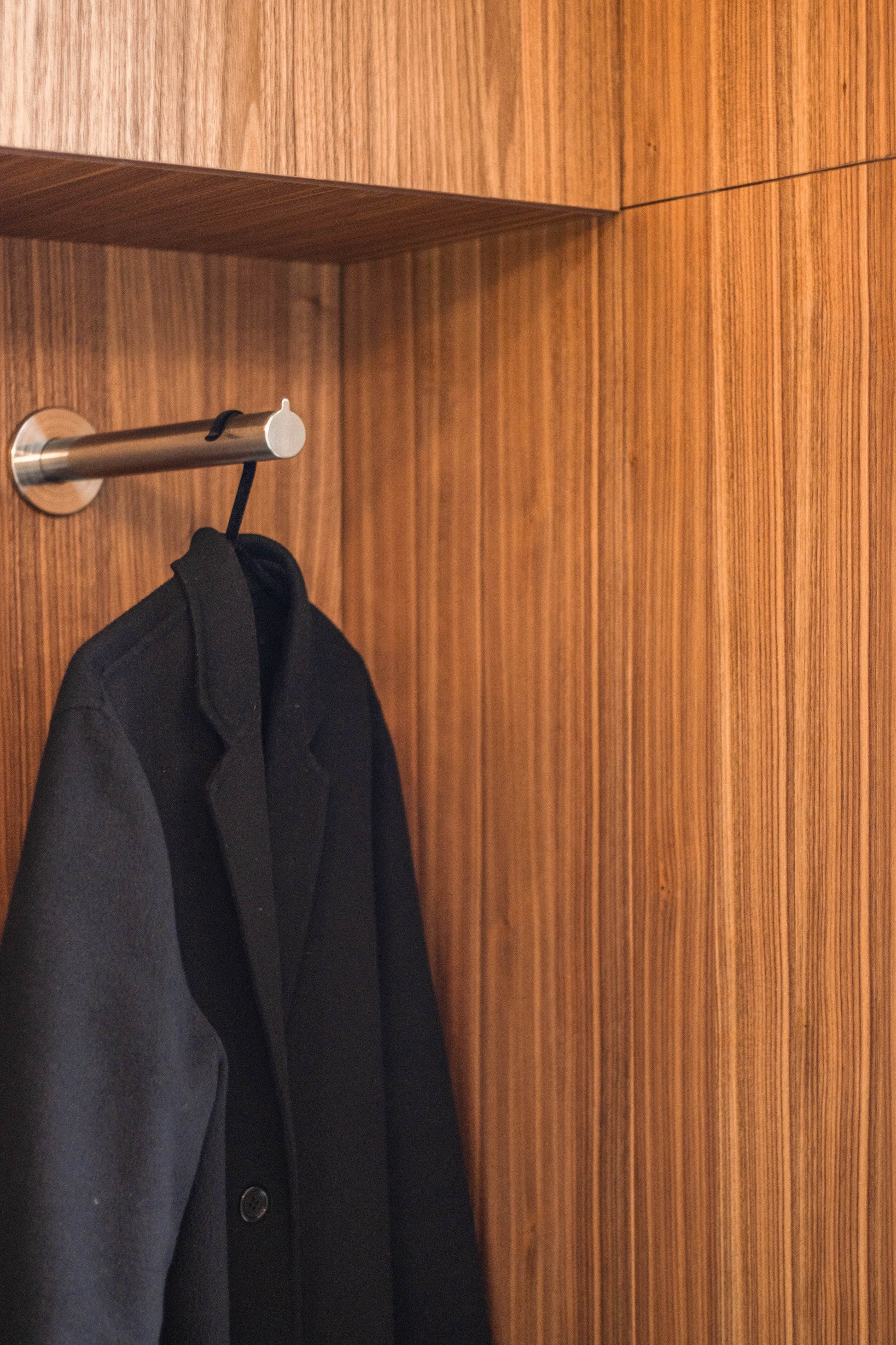De kast biedt niet alleen praktische opbergruimte, maar integreert ook een handige nis met roede voor jassen en een zitbankje om schoenen aan of uit te trekken. Alles is met oog voor detail ontworpen, van de strakke lijnen tot de onzichtbare grepen en het doorlopende houtpatroon over de kastdeuren.