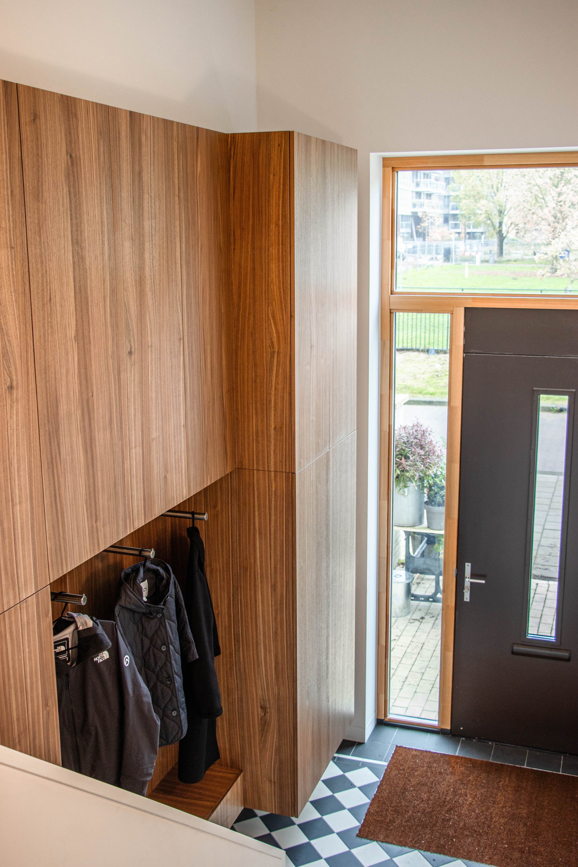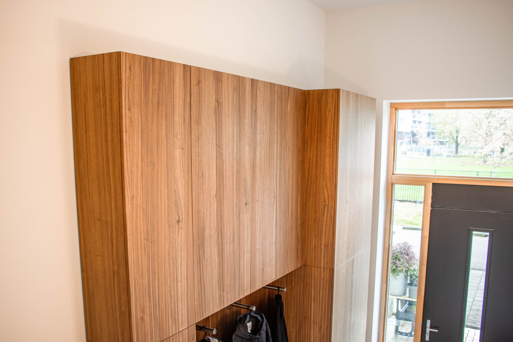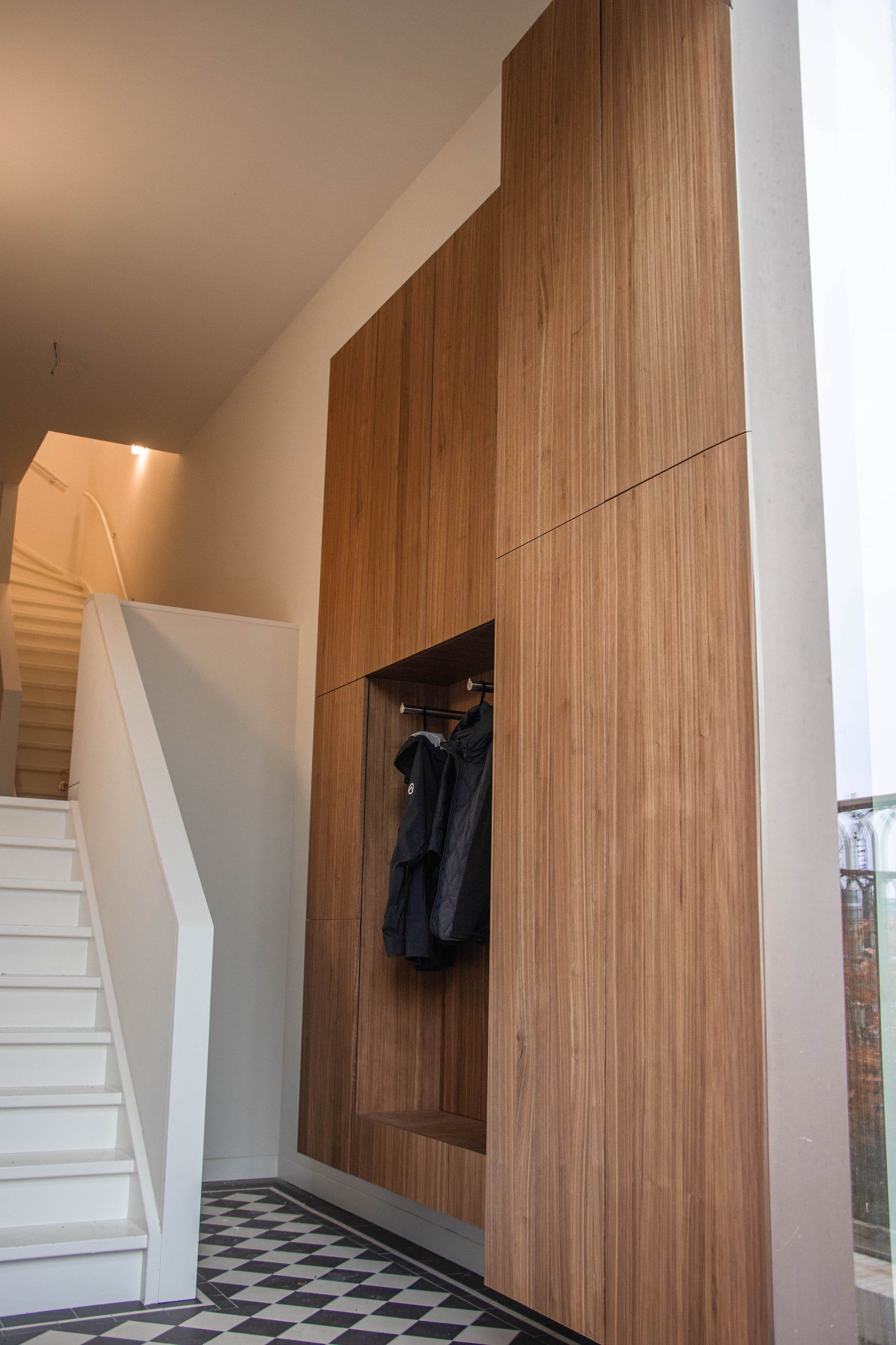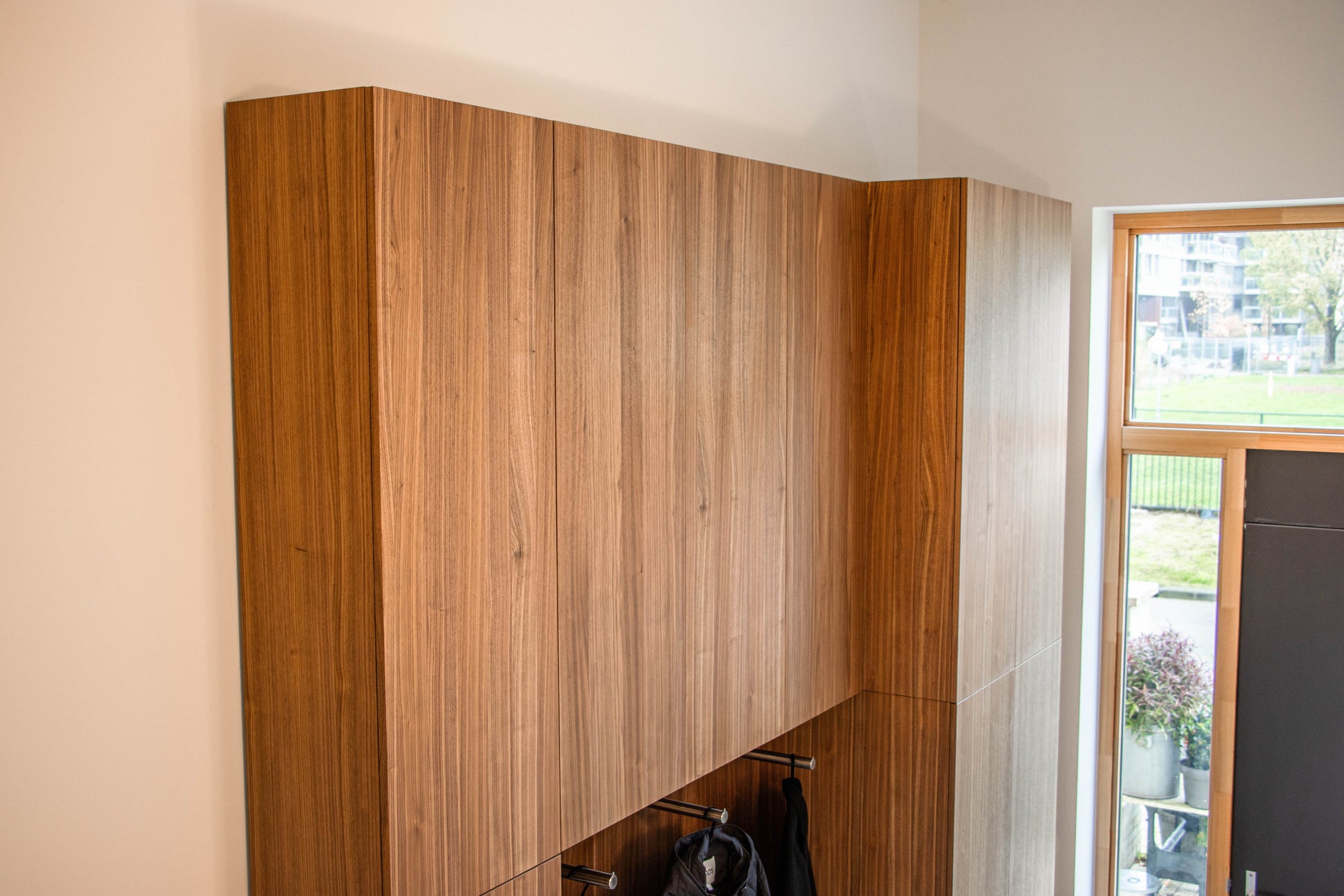 In deze stijlvolle entree in Amsterdam hebben we een op maat gemaakte wandkast gerealiseerd. De kast is vervaardigd uit warm notenhoutfineer en vormt een strak, functioneel geheel dat perfect aansluit op de ruimte en architectuur van de woning.