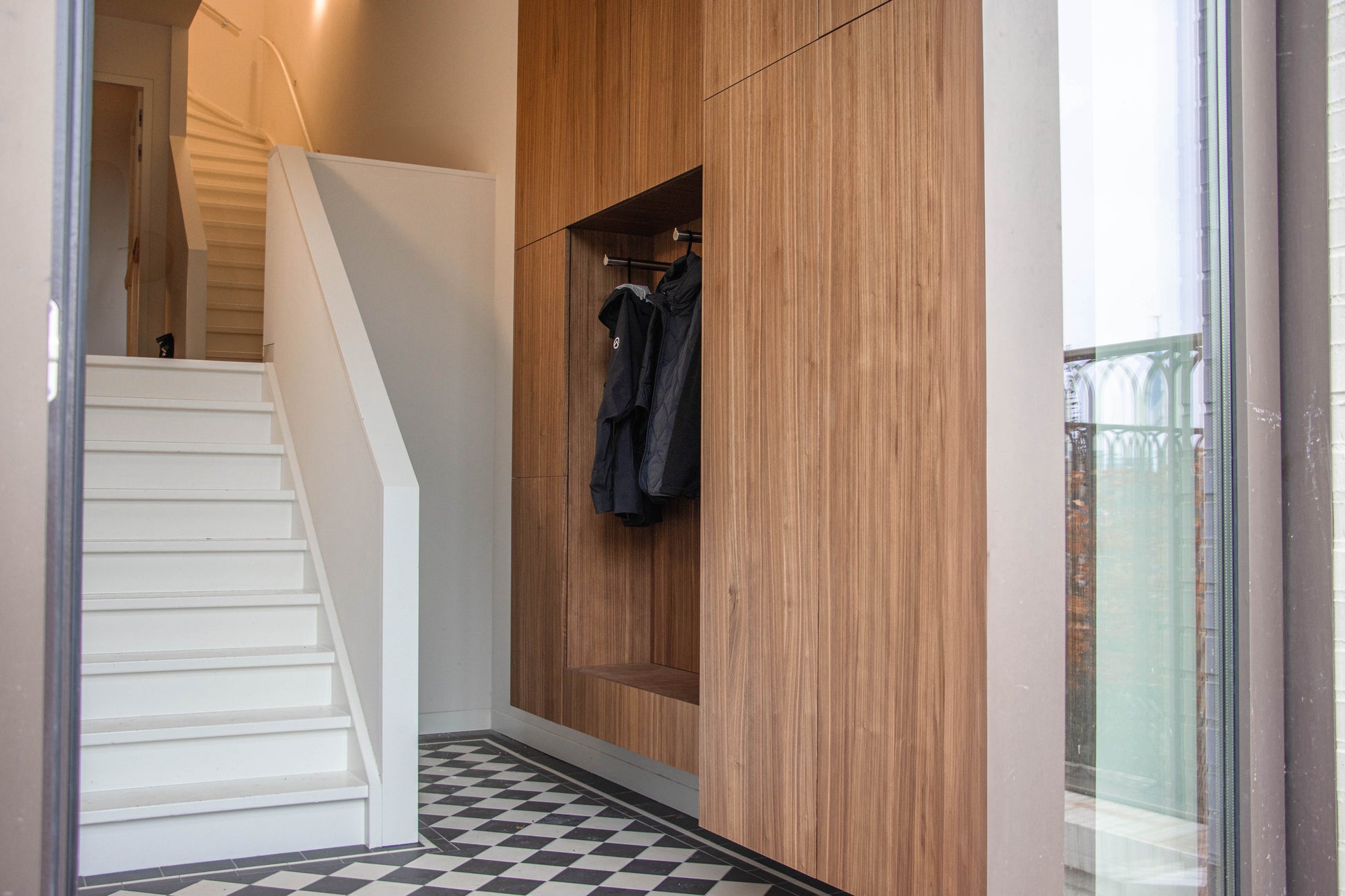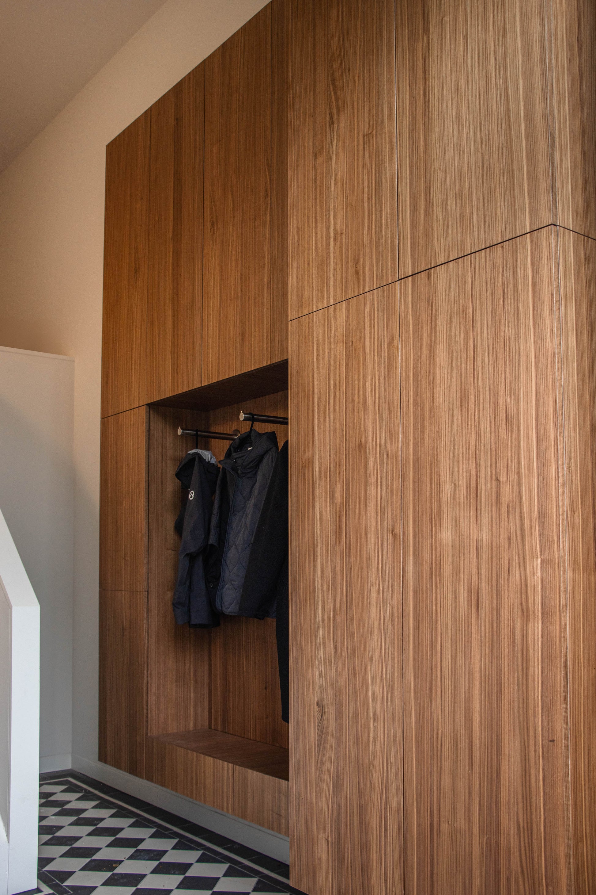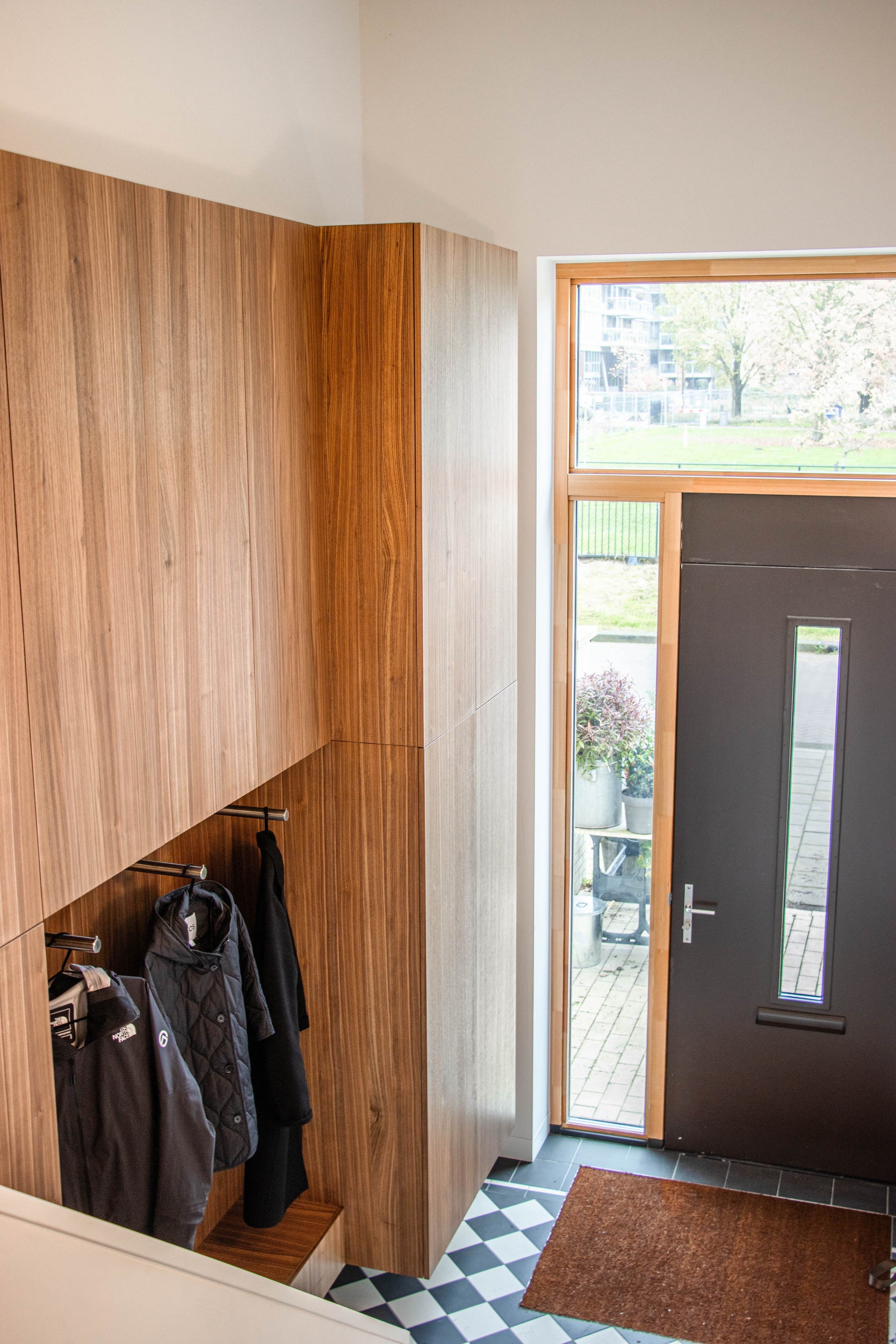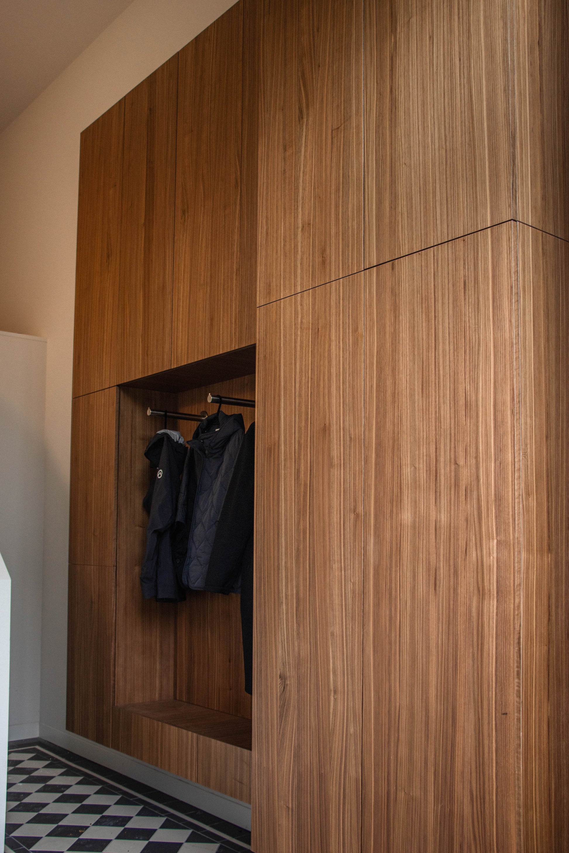 In deze stijlvolle entree in Amsterdam hebben we een op maat gemaakte wandkast gerealiseerd. De kast is vervaardigd uit warm notenhoutfineer en vormt een strak, functioneel geheel dat perfect aansluit op de ruimte en architectuur van de woning.