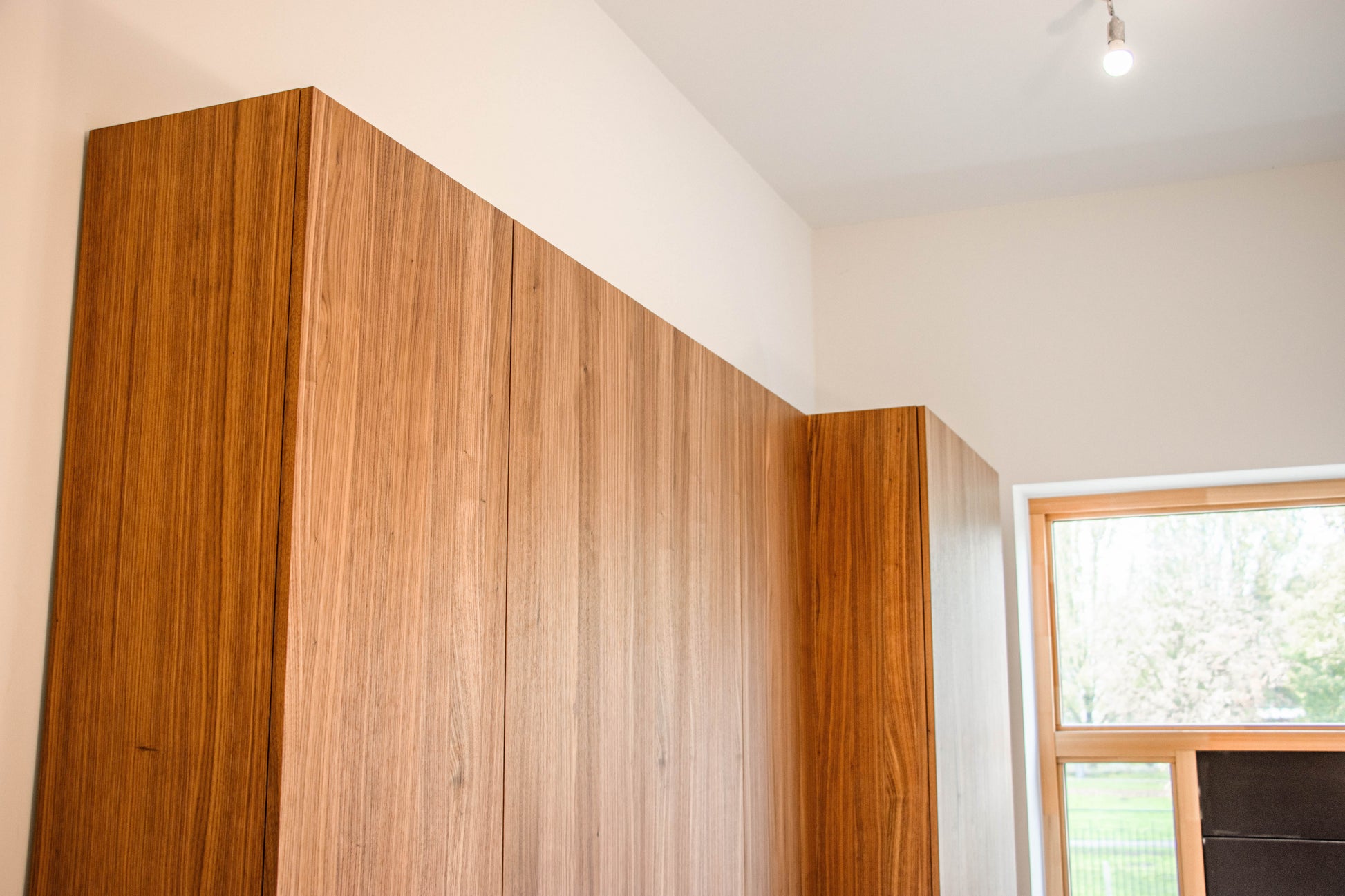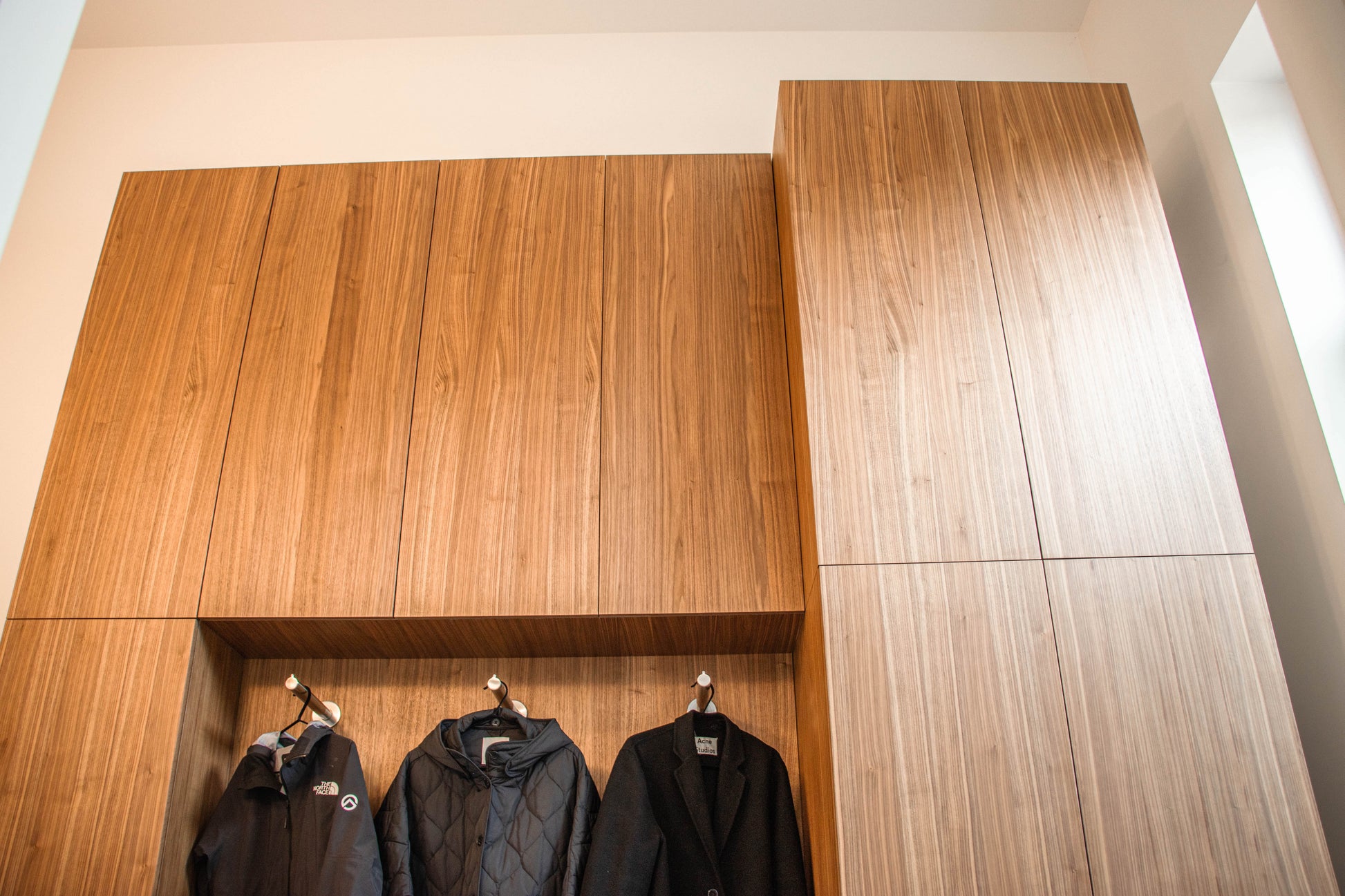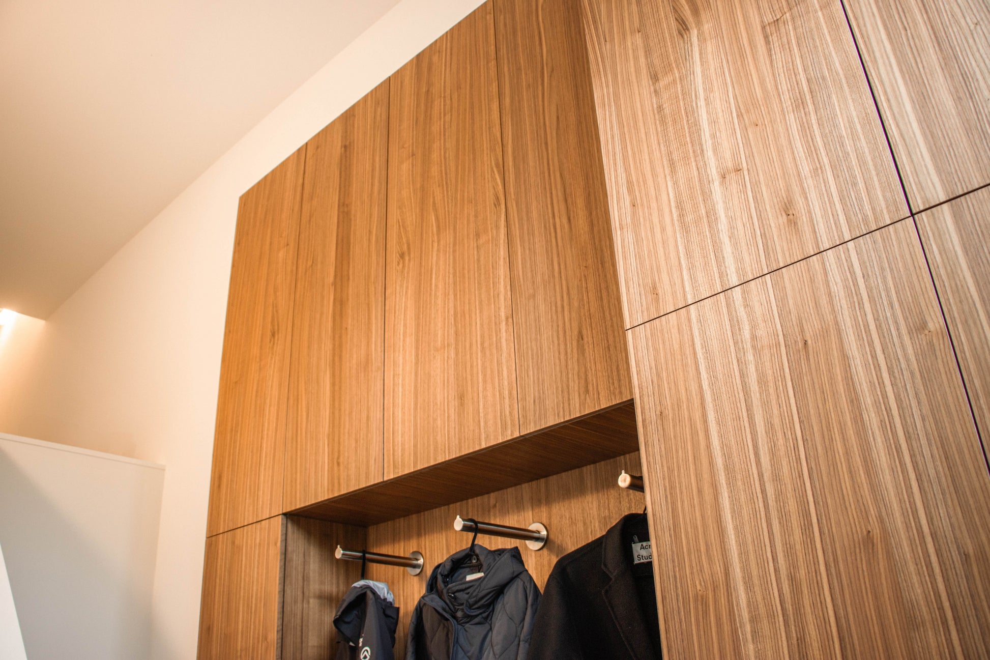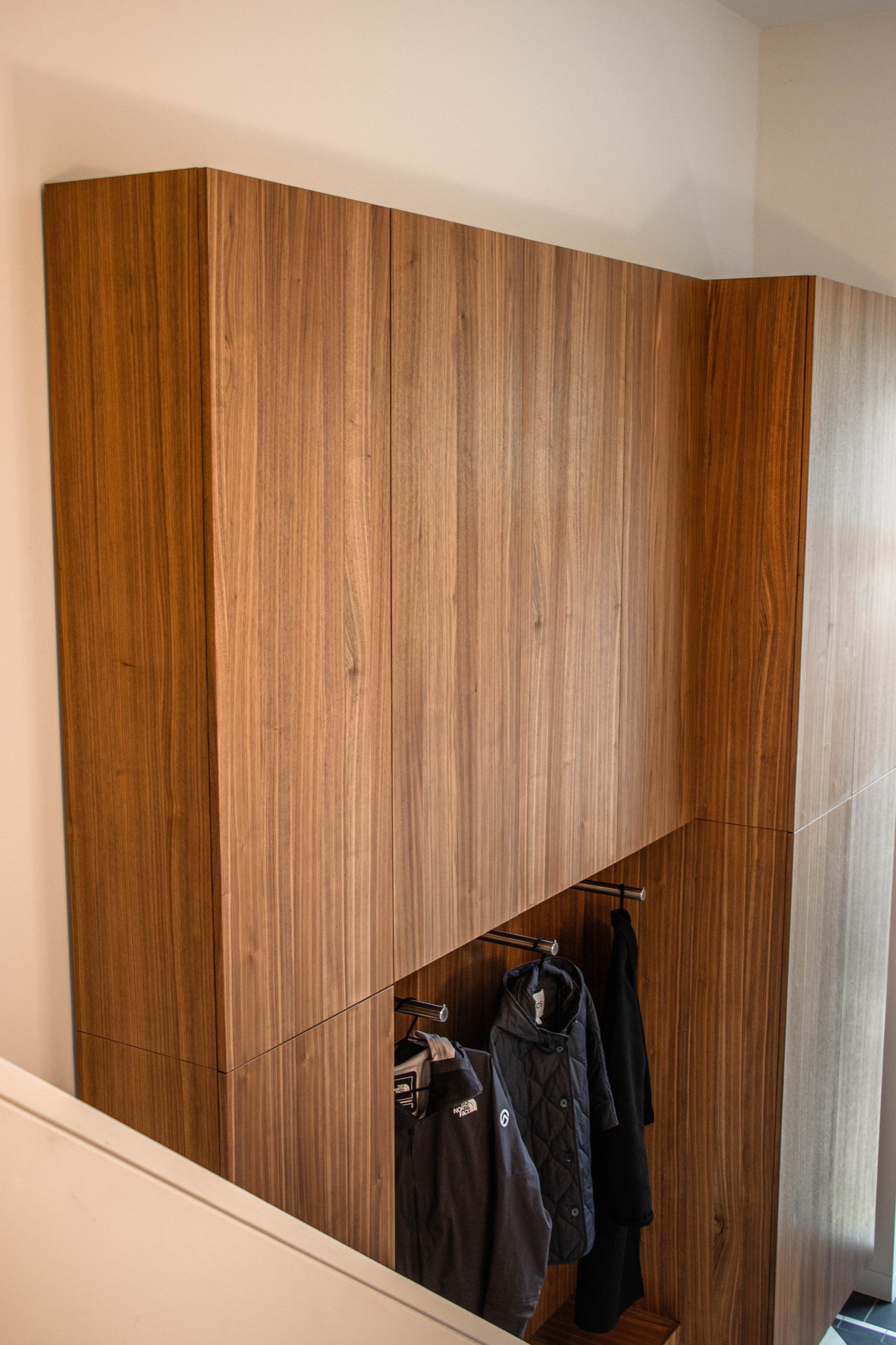 In deze stijlvolle entree in Amsterdam hebben we een op maat gemaakte wandkast gerealiseerd. De kast is vervaardigd uit warm notenhoutfineer en vormt een strak, functioneel geheel dat perfect aansluit op de ruimte en architectuur van de woning.