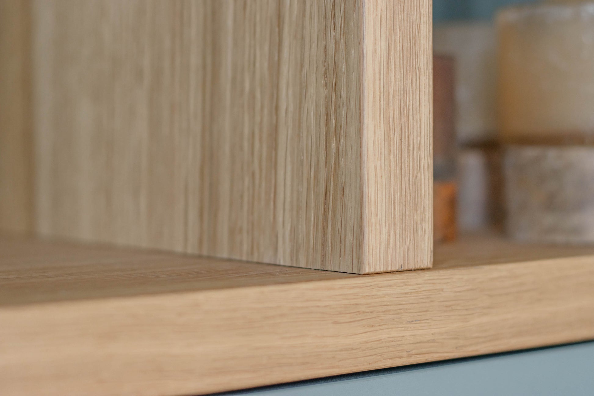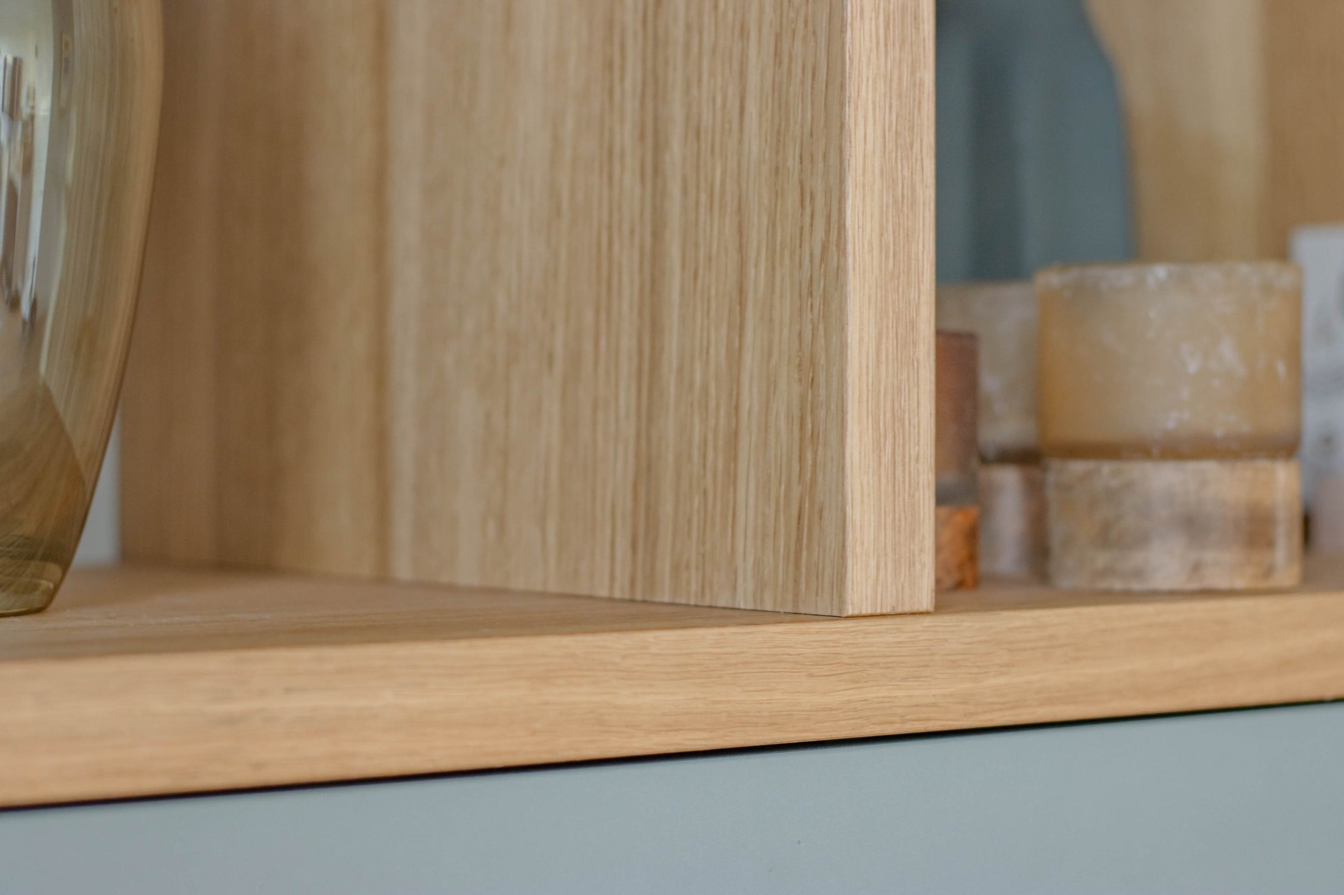 De kast is functioneel én stijlvol, met een indeling die optimaal gebruikmaakt van de beschikbare ruimte. Door het natuurlijke materiaal en de strakke afwerking vormt de kast een subtiele, maar krachtige toevoeging aan de ruimte.